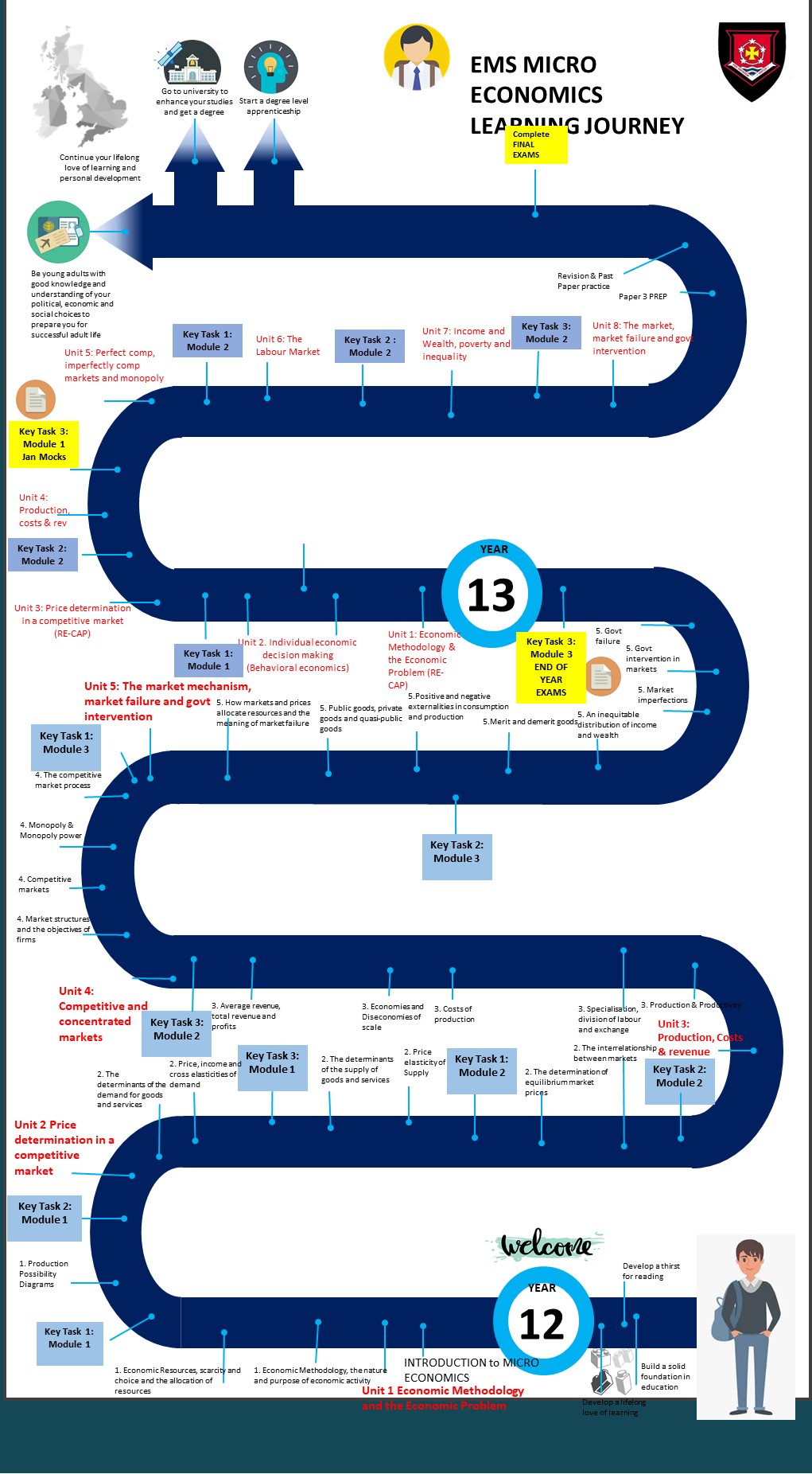 Whilst studying this area you will cover topics like: the economic problem and economic methodology; price determination in a competitive market; production, costs and revenue; competitive and concentrated markets; the market mechanism, market failure and government intervention in markets.