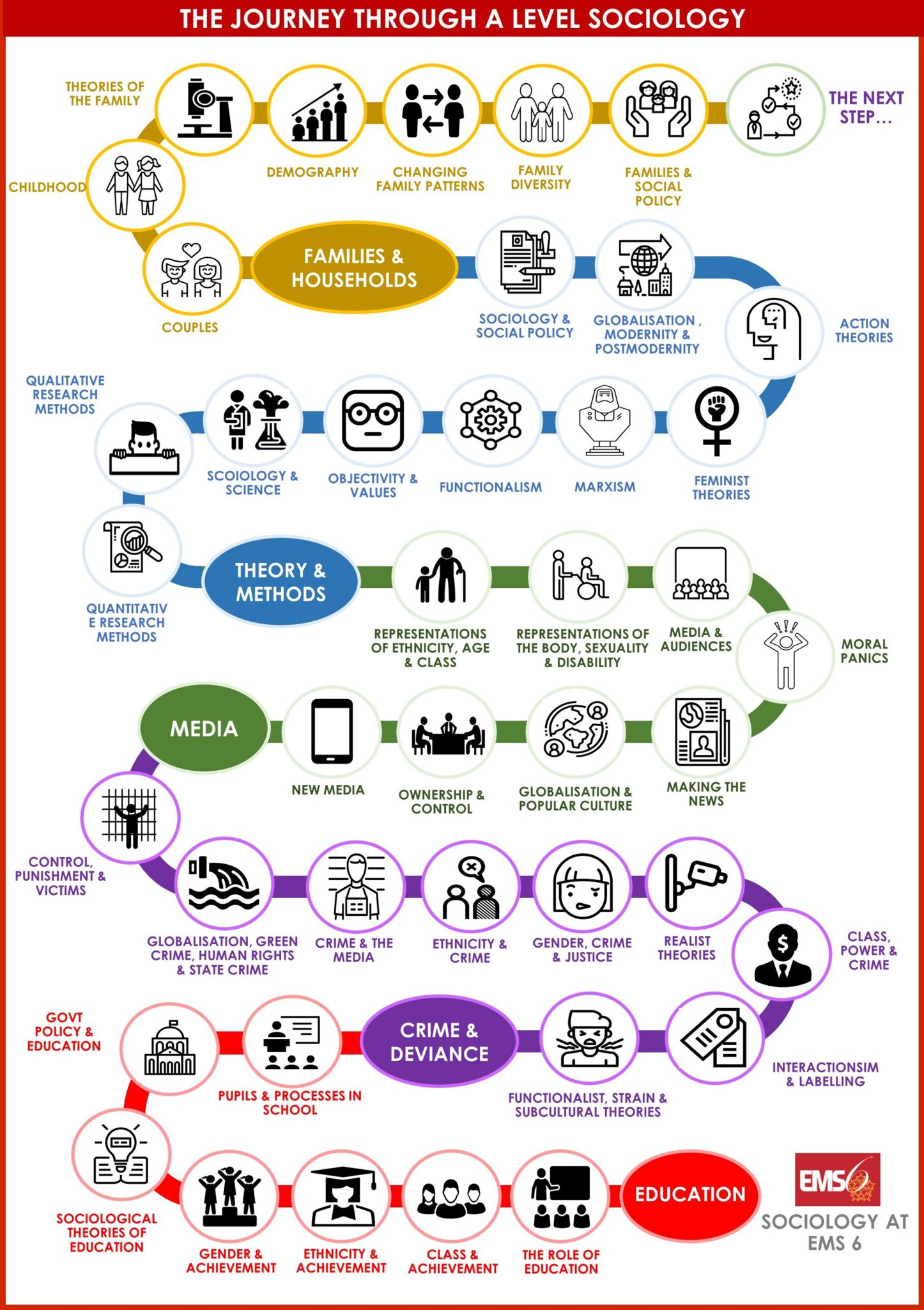 Sociology is the study of society – how it works, why it works, and how it could change. It’s a fascinating subject that covers all aspects of modern life. The key content you will cover will focus on; Crime and Deviance, Education, Families and Households and the Media.